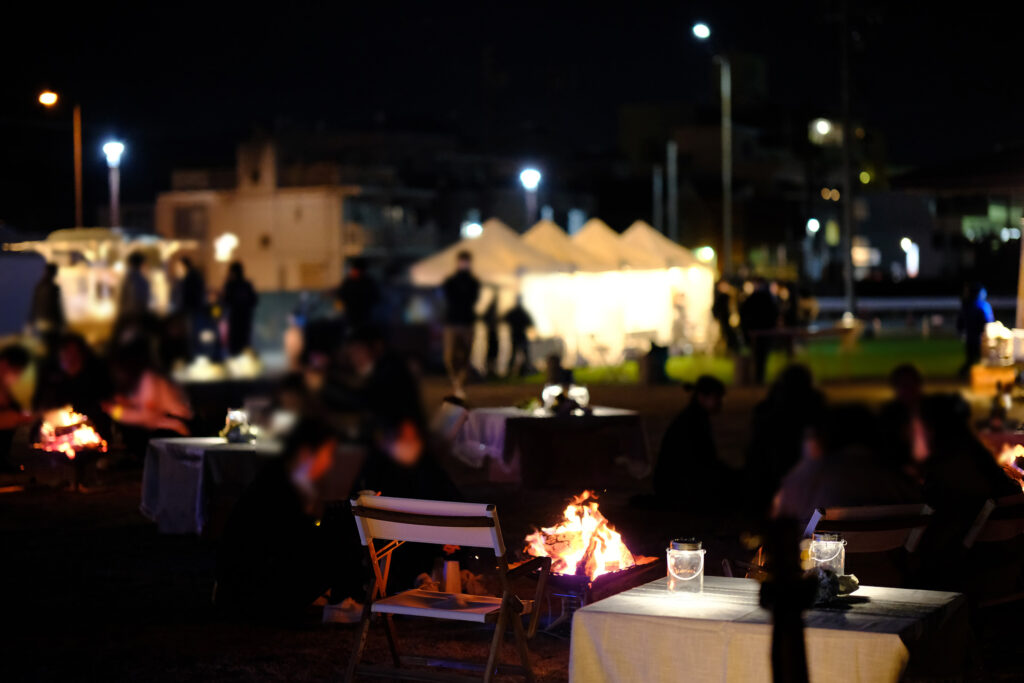 会場内は照明による夕刻の魅力的な演出と、飲食・物販・音楽などのコンテンツとともに、海辺のデッキやテーブル・イスで、のんびりとくつろぐことのできるイベントでした。
