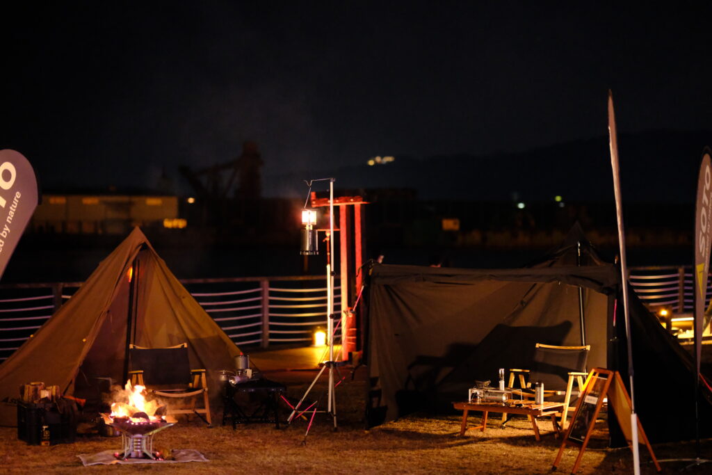 まだ、少し寒い季節でしたが会場中央のファイヤーピットではSOTOの焚き火台(エアスタ ST-940)を使用した焚き火で暖を取ることができ、お客様のくつろぎの場所となっていました。