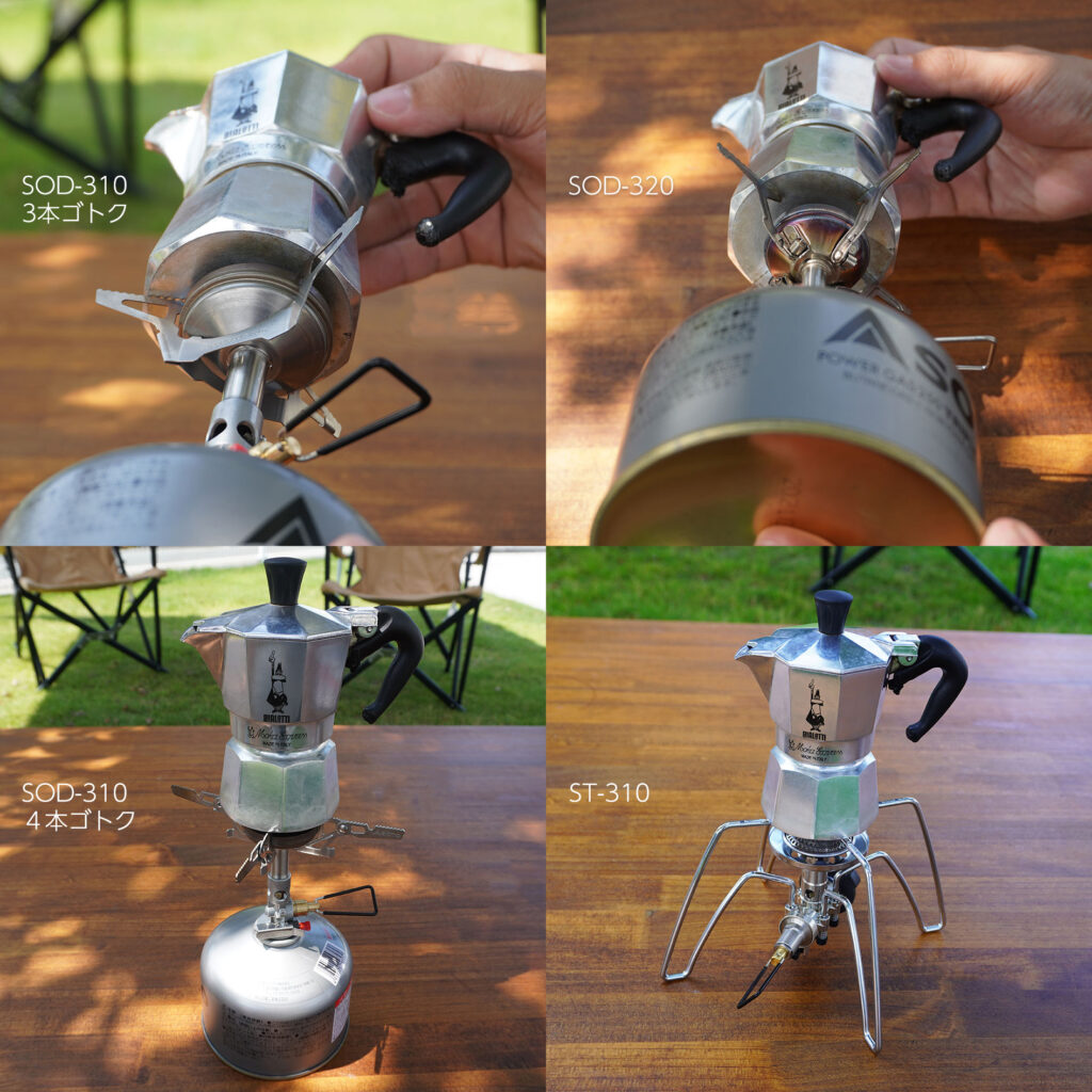 ウインドマスター SOD-310の3本ゴトクと4本ゴトク、アミカス SOD-320、そしてレギュレーターストーブ ST-310の4台に、モカエキスプレス1カップ用が載せられました。