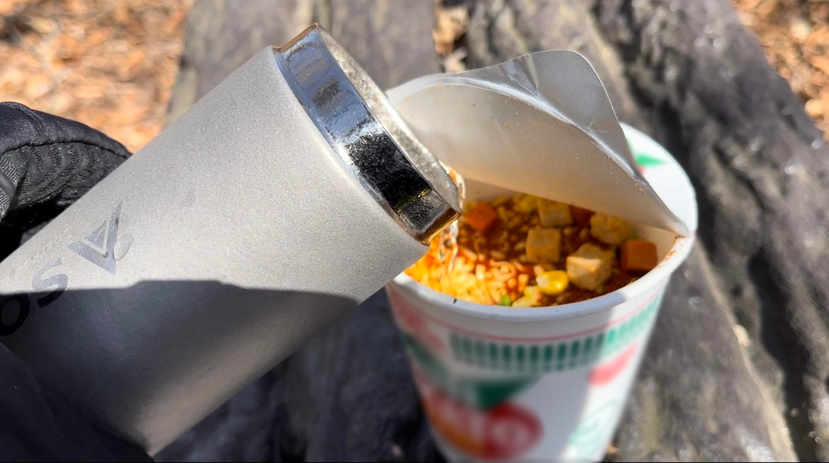 定番サイズの縦型(筒形)カップ麺は300ml+αのお湯でつくることができますので、カップ麺用のお湯を運ぶと割り切ってもよいかもしれません。