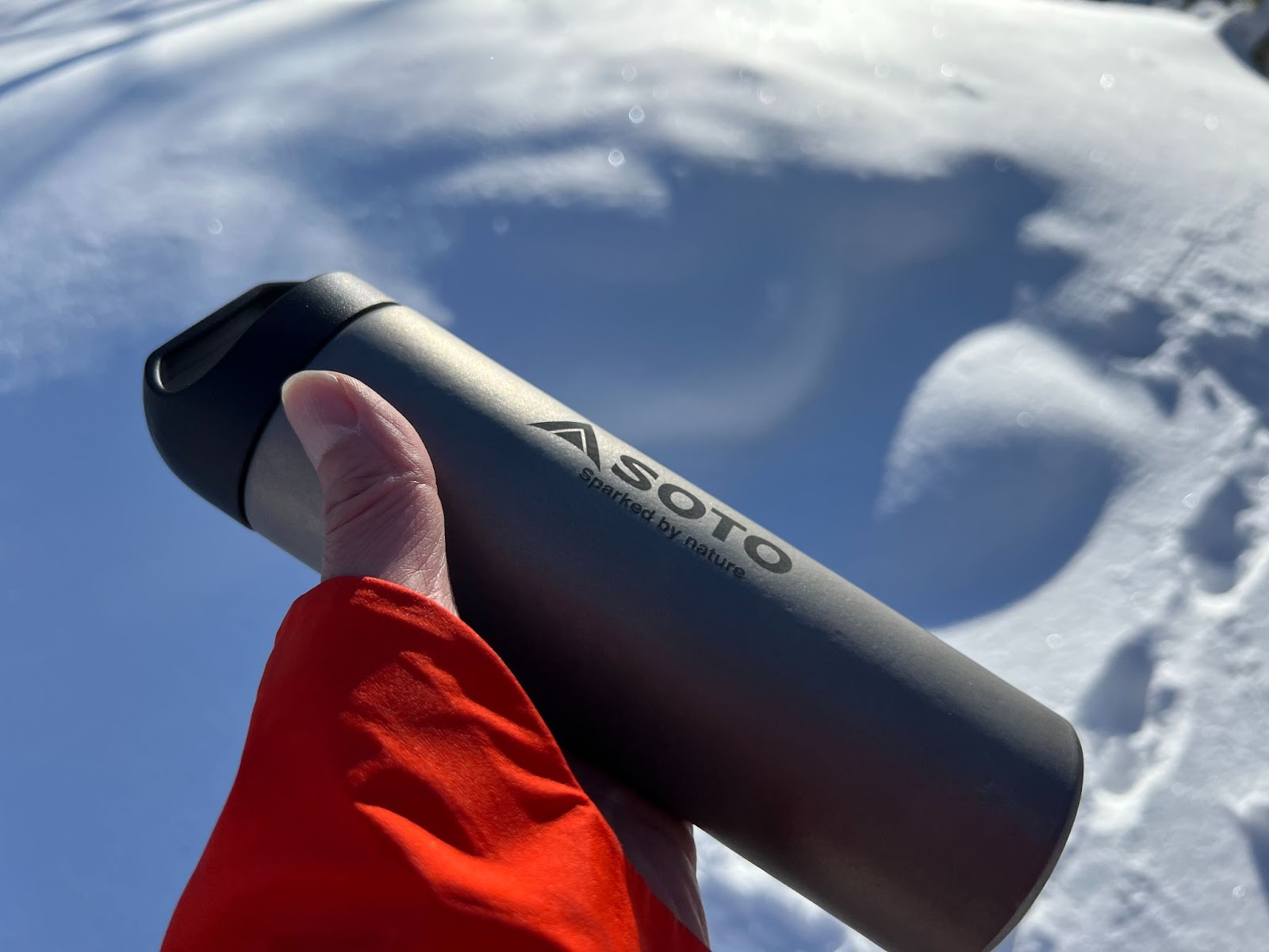 チタンボトルはダブルウォールなのでボトル内の温度をキープすることができ、なおかつ軽いため、過酷な環境で呼び水を運ぶのにも最適です。