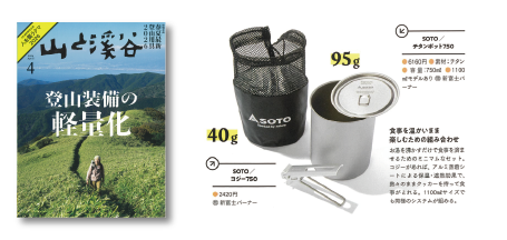 「特集 登山装備の軽量化 買い換え&使いこなしのポイント」で、チタンポット750 SOD-530、コジー750 SOD-5212が紹介されました。