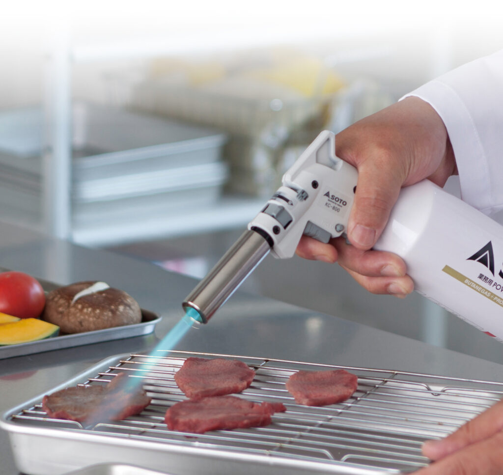 軽量で多機能なプロ向き料理用バーナーです。片手で点火、消火の操作ができるトリガー式。