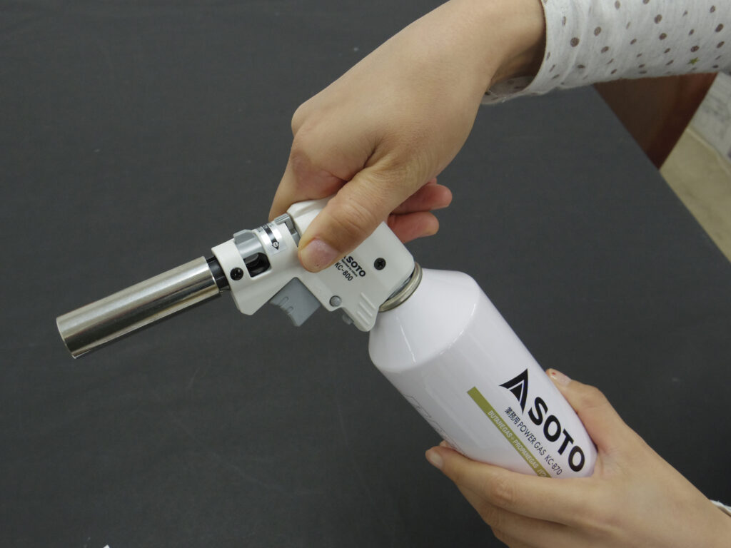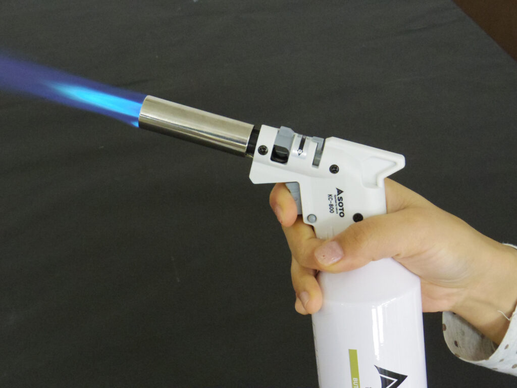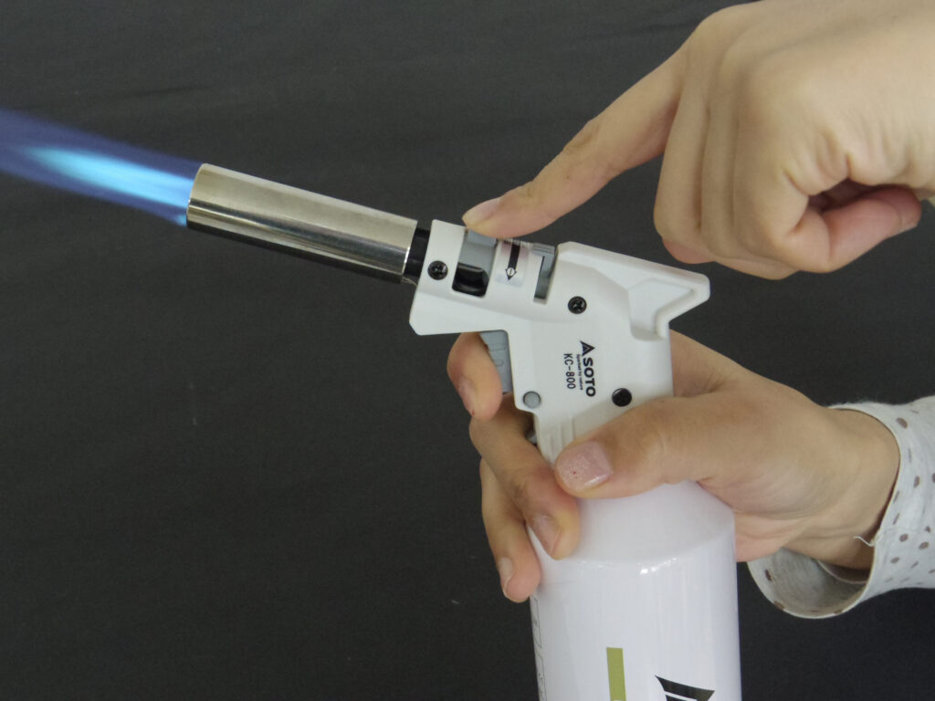 点火ボタンを【握れば点火】【離せば消火】のワンアクション操作です。