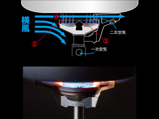 ③一次空気をバランスよくガスに配合させたのちに、バーナーヘッド中心のくぼんだスペースへ二次空気を取り込むことで、完全燃焼の炎をつくり出します。 強風時にも炎の中心がほとんど流されず、鍋底の中心を加熱し続け短時間で水を沸騰させることができます。これにより、風が強い山や海などでも無駄なガスの消費を抑えることができるので、パッキングするガスの量を減らし荷物の軽量化にも繋がります。 -