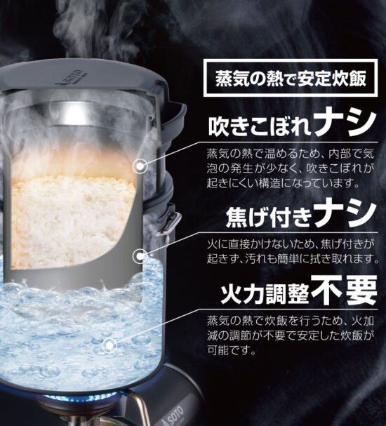 蒸気の熱で炊飯を行うため、火加減の調節が不要で安定した炊飯が可能です。 -