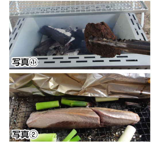 炭火を起したバーベキューコンロにピートスモークブロックを4〜6個入れます。(写真①) 煙が出てきたら食材を焼きはじめ、アルミホイルをかぶせます。(写真②)食材により焼き時間を調整してください。
