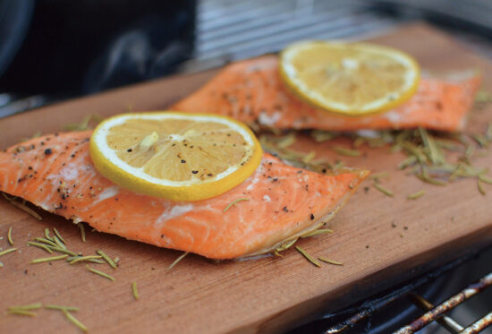 食材の下に水分を含ませた「シダーグリルプレート」を敷いて焼くだけで、簡単にスモークが完成します。