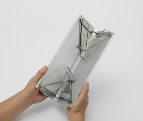 パッと開いてサッと閉じる! A4ハーフサイズに小さくたためるソロテーブル。 独自構造によりワンアクションで4本のスタンドが飛び出し、そのまま設置可能。片付けも簡単スピーディ。