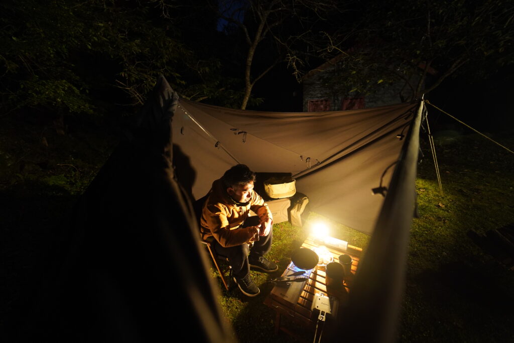 天気の良い夜は幕内で横風を防ぎながら、沸かしたてのホットドリンクを片手にお楽しみ頂けます。 -