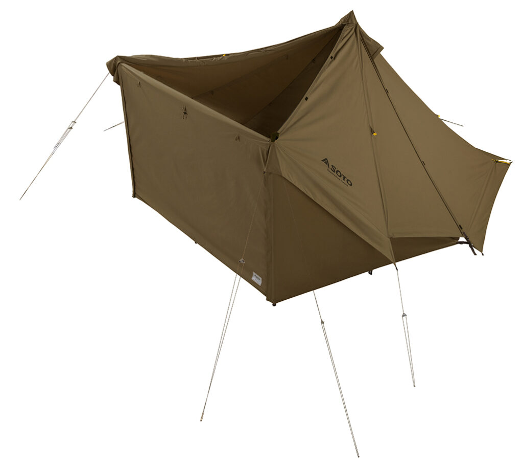 シェルターと陣幕を組み合わせたスタイルで、ベンチレーターと天幕を開いた換気状態であれば、SOTO製のガス式燃焼器具を使用することができます。