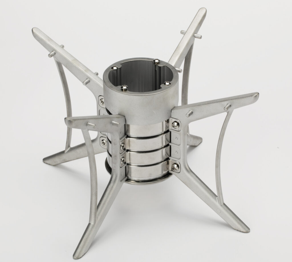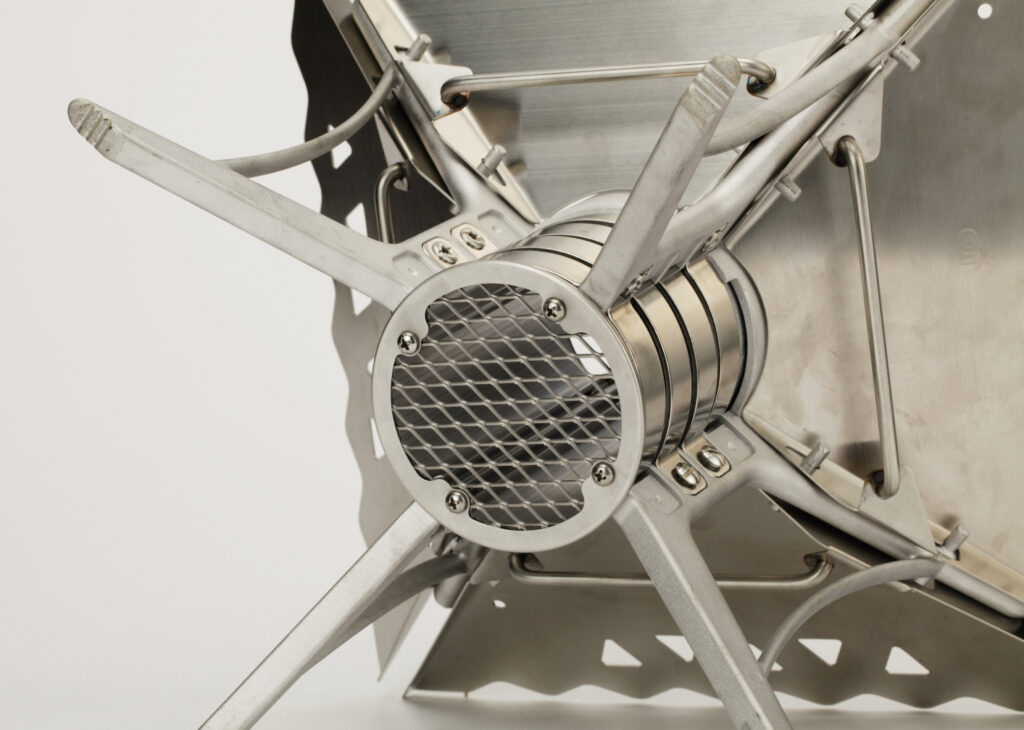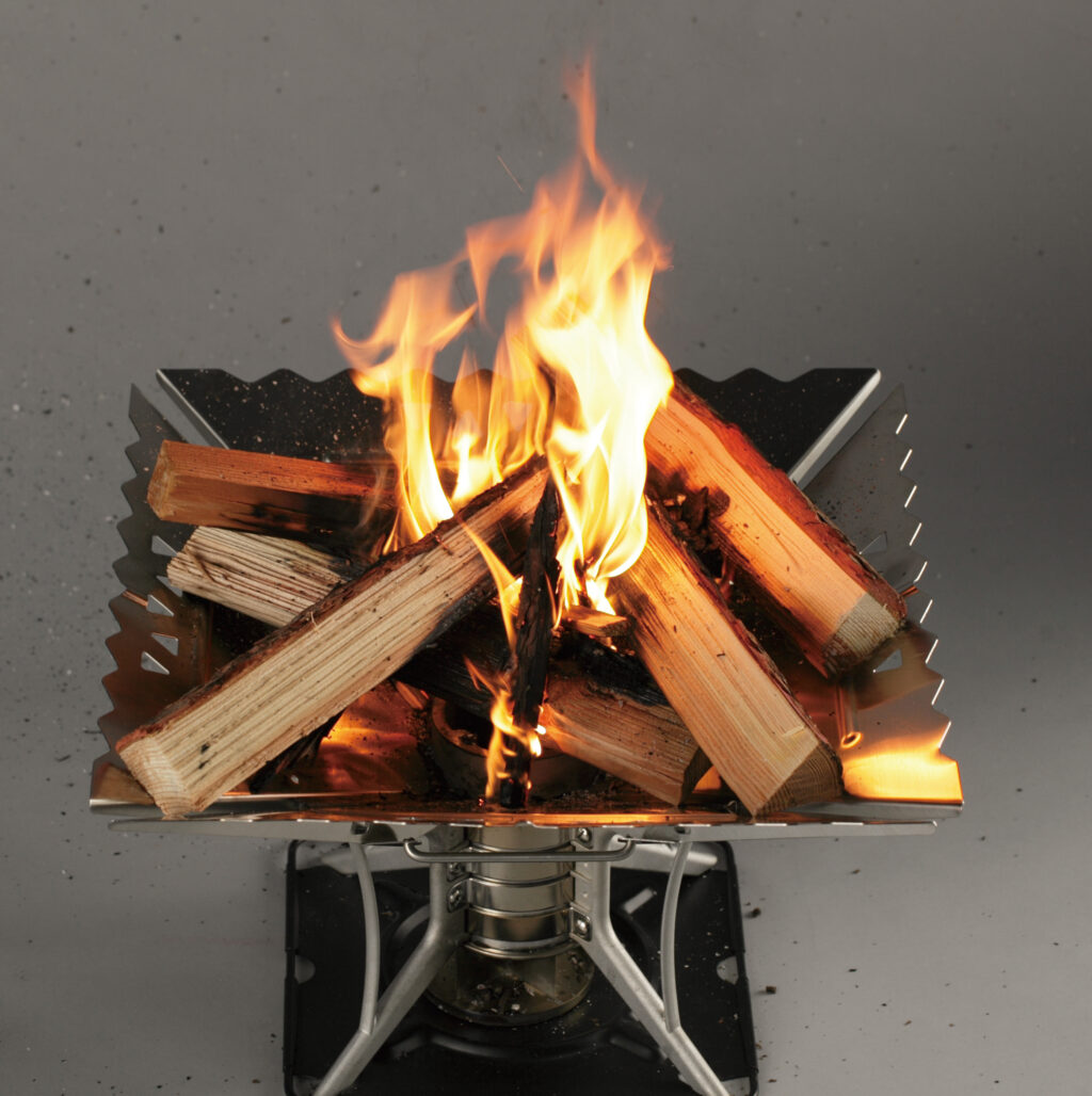 薪への着火を容易にする近未来的「焚き火台」。