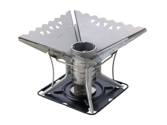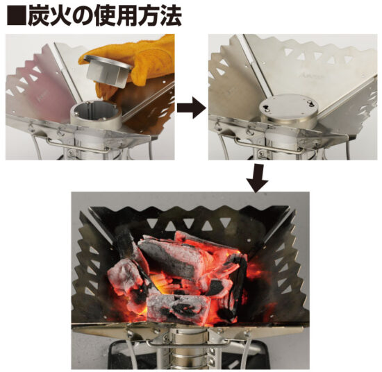 ベース中央の筒上部をフィンキャップを使い、ふたをすることで、炭火にも対応します。