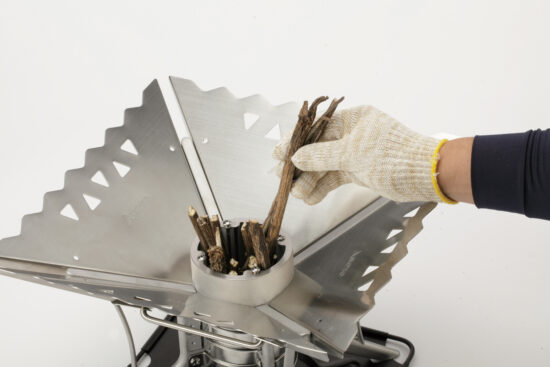 ①小枝など燃えやすいものを種火としてベース中央の筒に入れます。