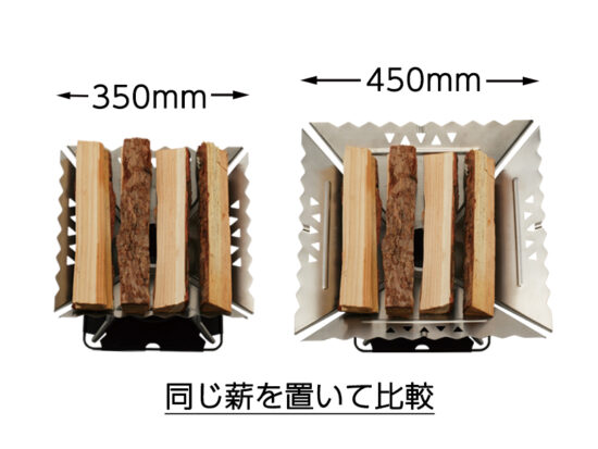 ウイングMとウイングLに、同じ薪を置いて大きさを比較。