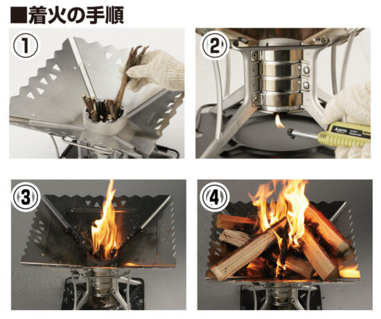 ③④種火が起きたら焚き木を置きます。 着火後、火が安定したらやけどに注意して火ばさみ等でフィンキャップを取り外します。
